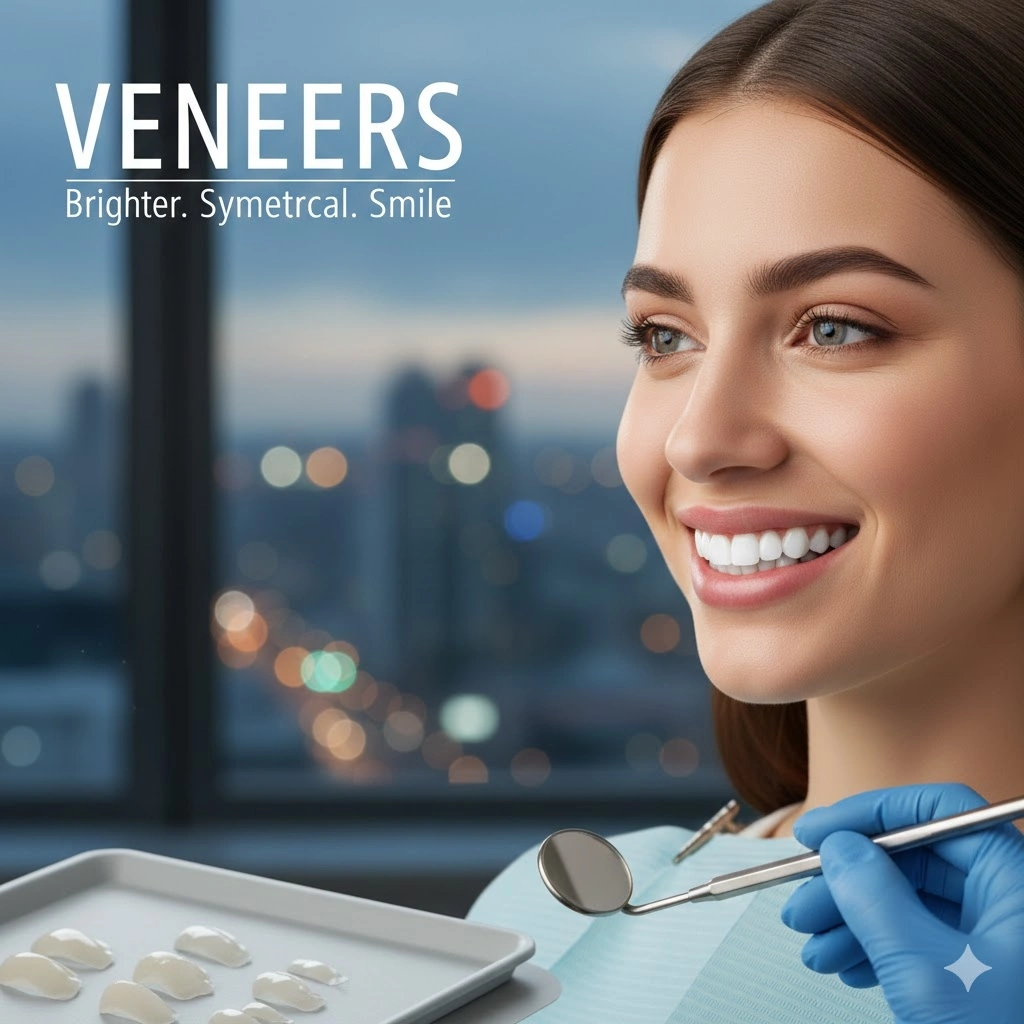 Dental veneers are thin porcelain or composite shells bonded to the front of teeth to enhance their shape, color, and overall appearance. They are commonly used to correct chipped, stained, misaligned, or uneven teeth.